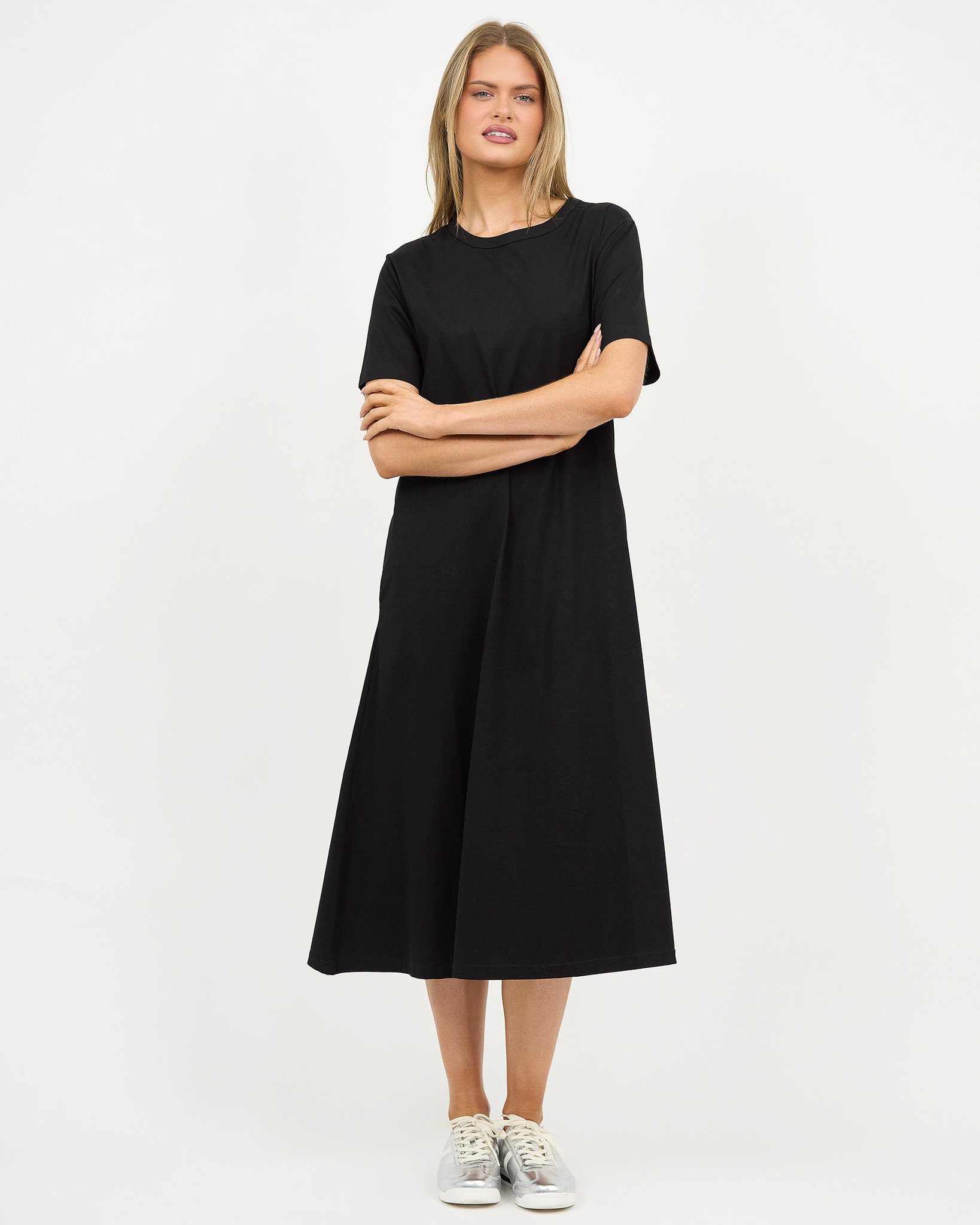 The Cotton Jersey Dress offers effortless style with its relaxed A-line silhouette. Designed for comfort and ease, this dress features a curved neckline, short sleeves, and practical side pockets—all crafted in soft, stretch cotton jersey.