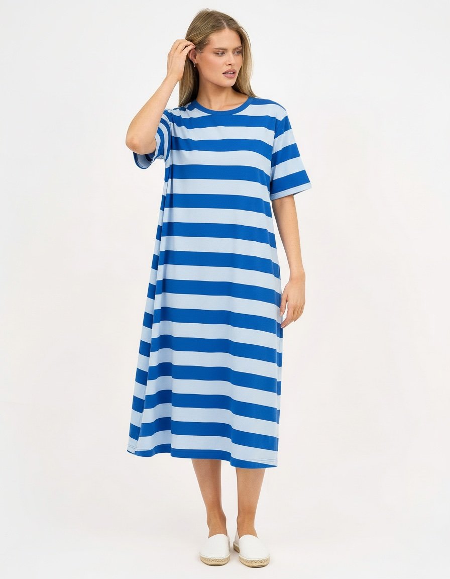 The Cotton Jersey Dress offers effortless style with its relaxed A-line silhouette. Designed for comfort and ease, this dress features a curved neckline, short sleeves, and practical side pockets—all crafted in soft, stretch cotton jersey.