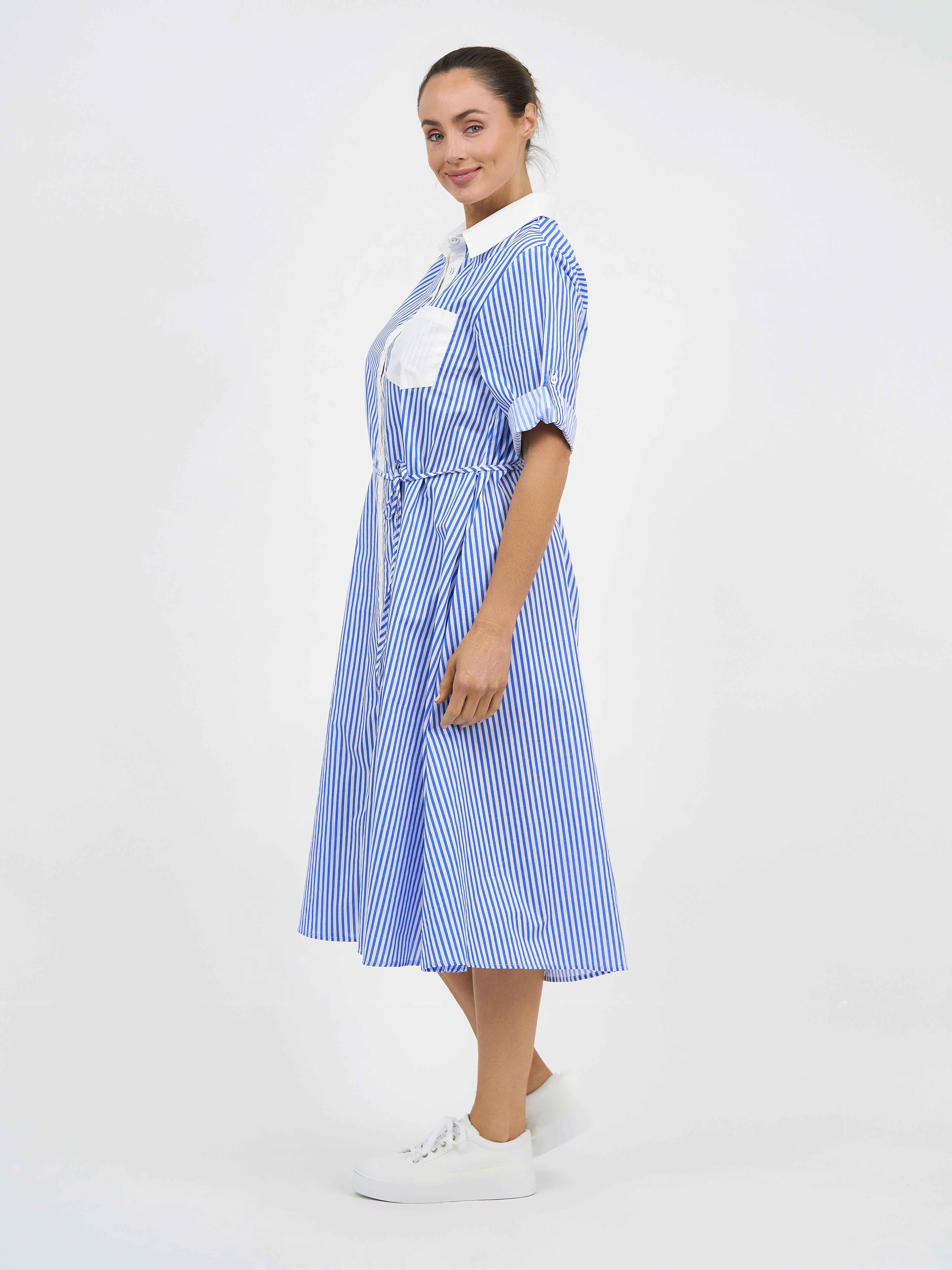 Elevate your everyday look with our Cotton Relaxed Shirt Dress, featuring elbow-length sleeves with tabbed detail, convenient side pockets, and a chic midi length.