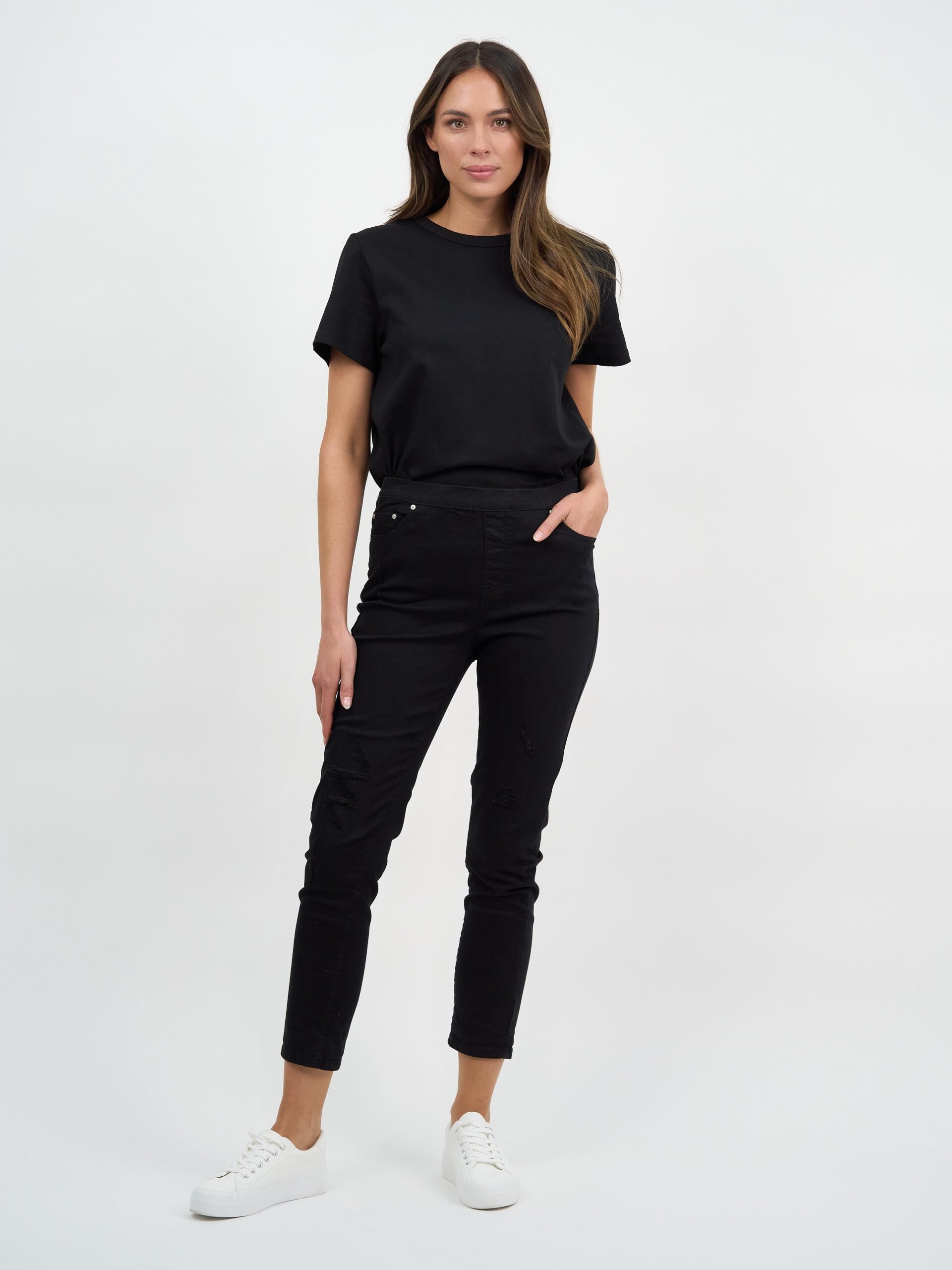 With our Distressed Pull On Jean, you can put an end to your jeans struggles. Unlike stiff denim, our buttery soft cotton stretch fits like a glove, leaving plenty of room for your beautiful curves giving you an elegant and slender fit.