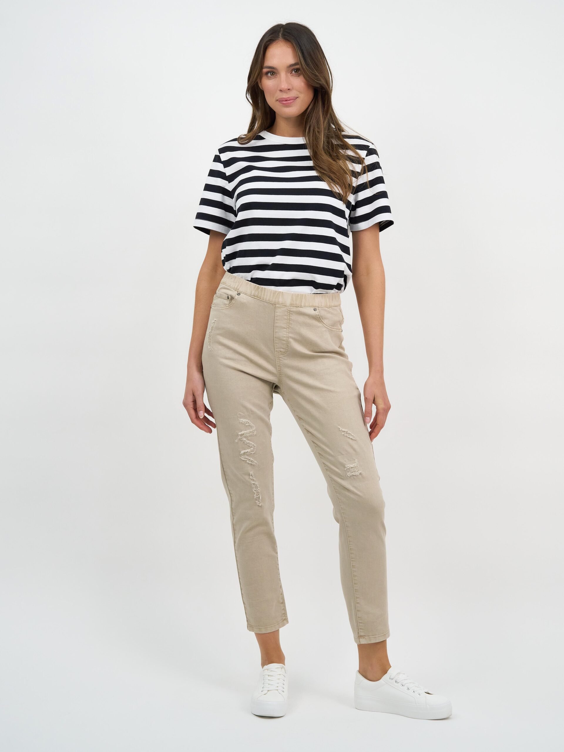 With our Distressed Pull On Jean, you can put an end to your jeans struggles. Unlike stiff denim, our buttery soft cotton stretch fits like a glove, leaving plenty of room for your beautiful curves giving you an elegant and slender fit.
