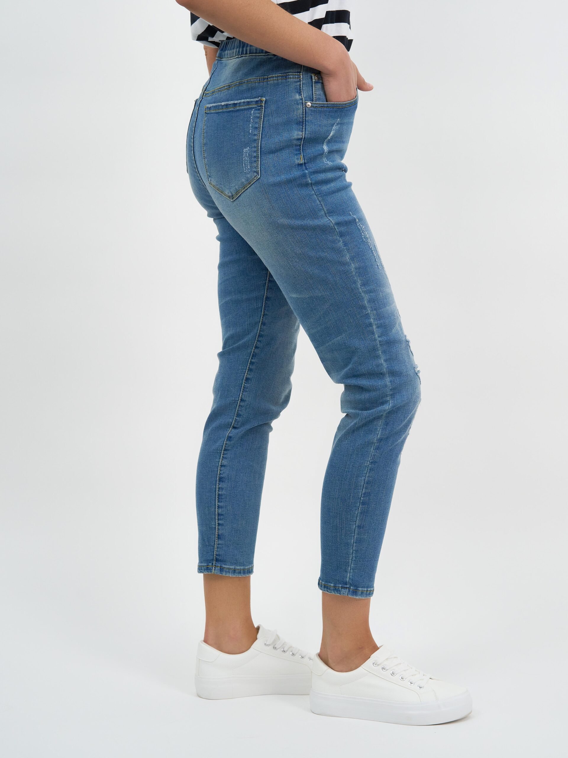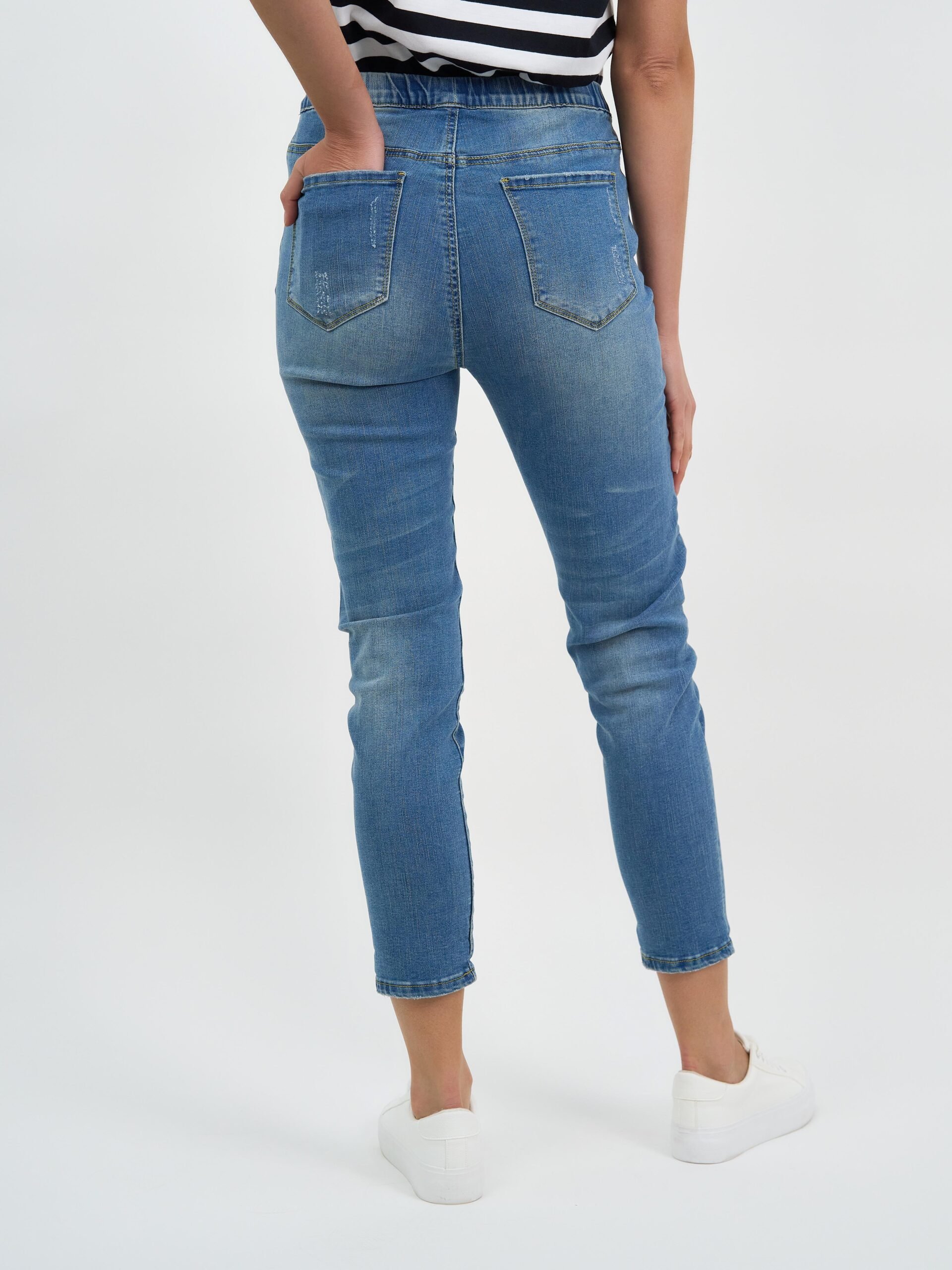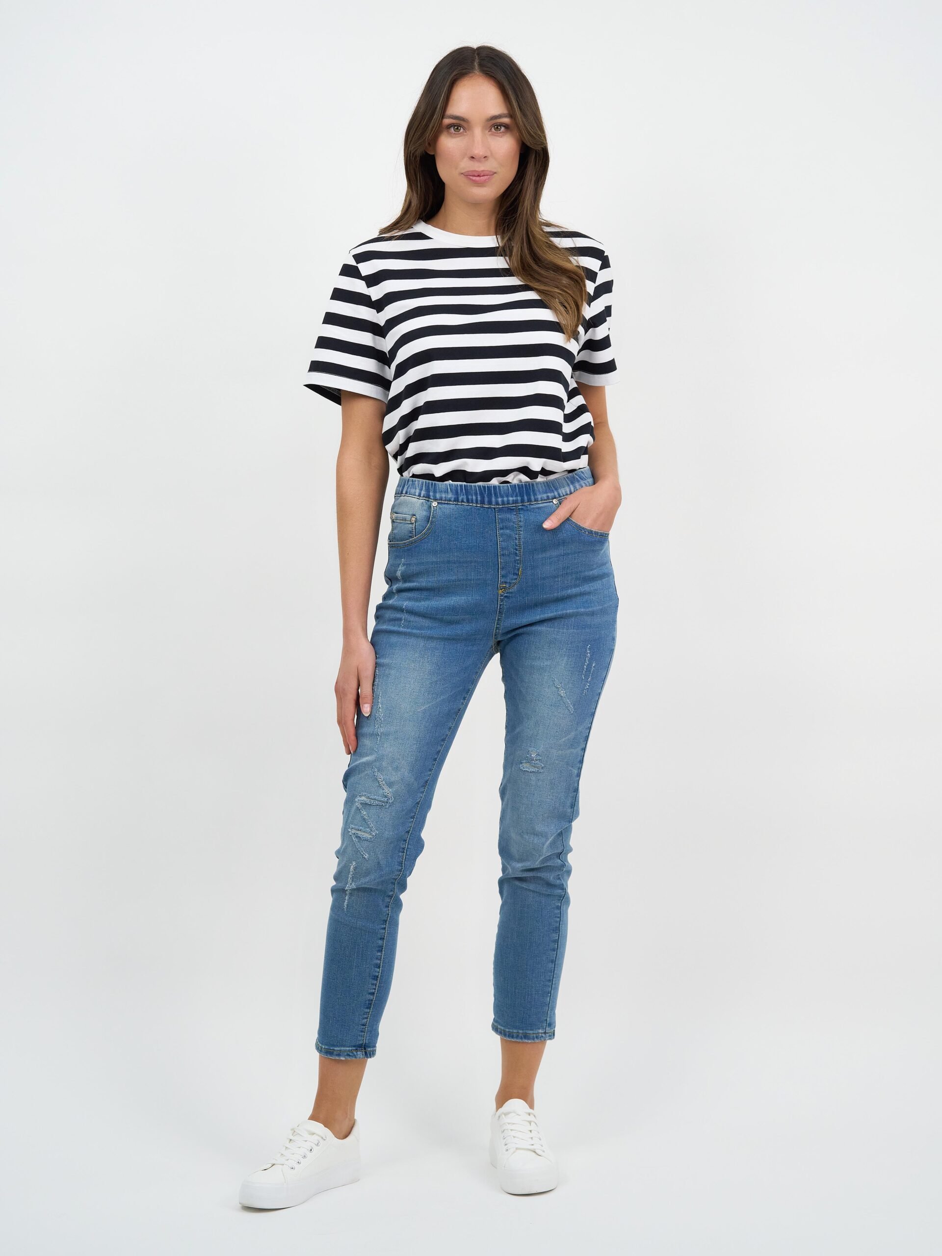 With our Distressed Pull On Jean, you can put an end to your jeans struggles. Unlike stiff denim, our buttery soft cotton stretch fits like a glove, leaving plenty of room for your beautiful curves giving you an elegant and slender fit.