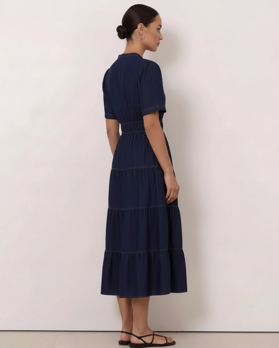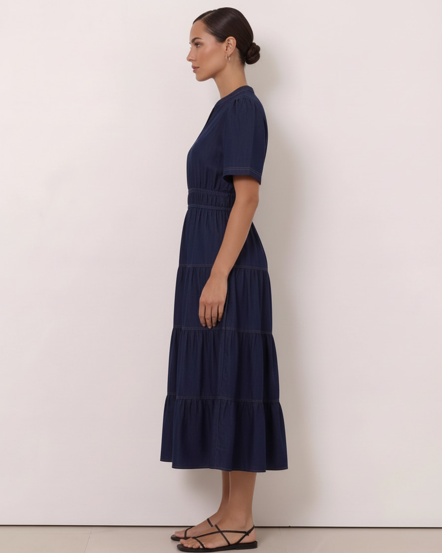 Experience the perfect blend of style and comfort with the Denim Tier Detail Dress, featuring a flattering V-neckline, a soft elastic waistline, and striking contrast orange stitching. This versatile midi length dress offers short sleeves and convenient side seam pockets, making it an effortless choice for any occasion.