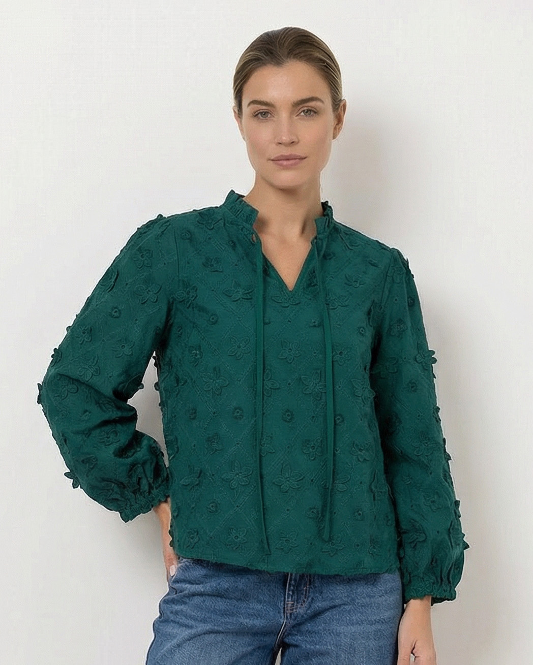 Feel confident in our Embroidered Neck Tie Top, made in textured embroidery, with intricate detailing and a tie neckline. Style it with dark denim and block heels or ankle boots for a look perfect for office days, then wear it with heeled boots or strappy heels for an evening look.