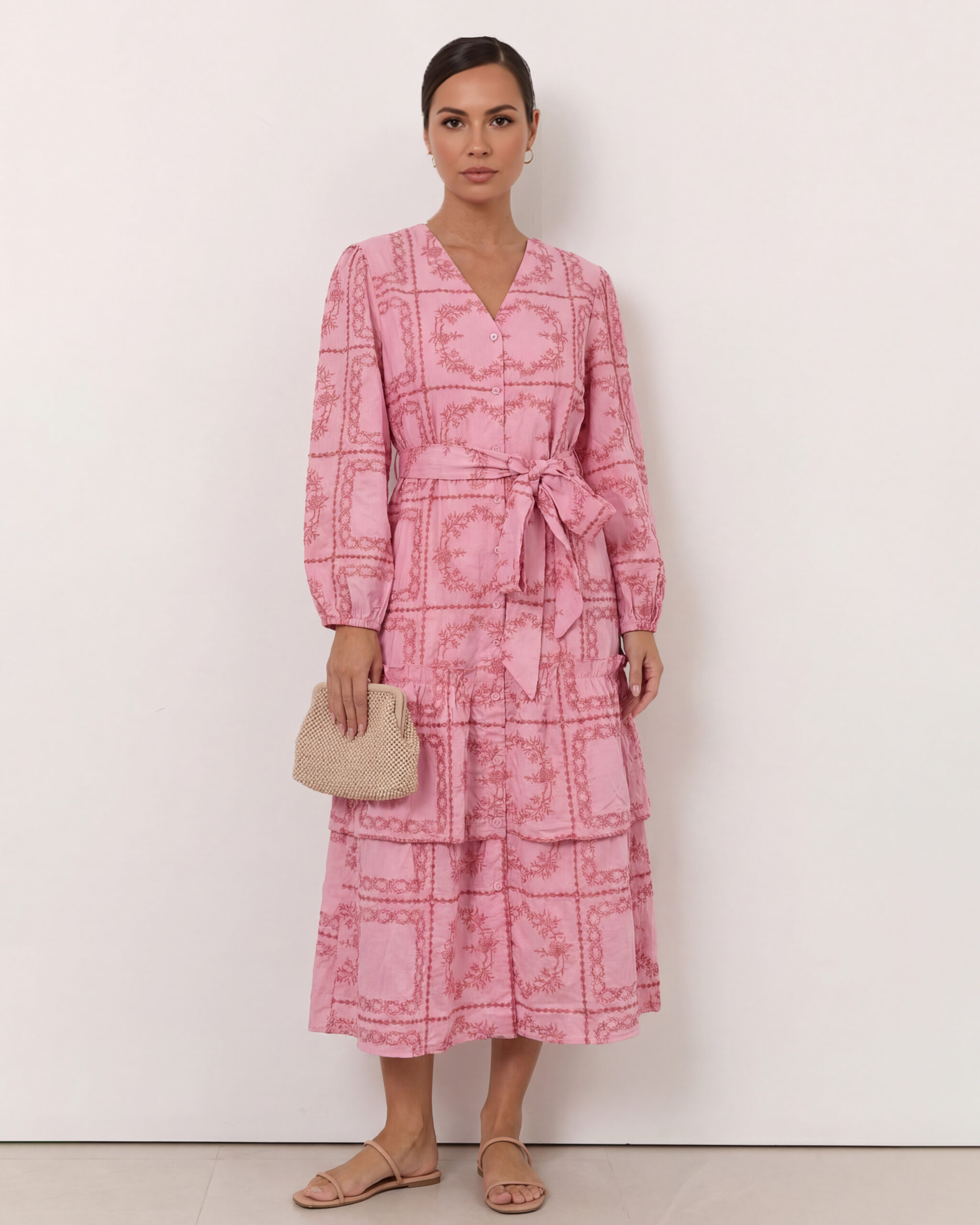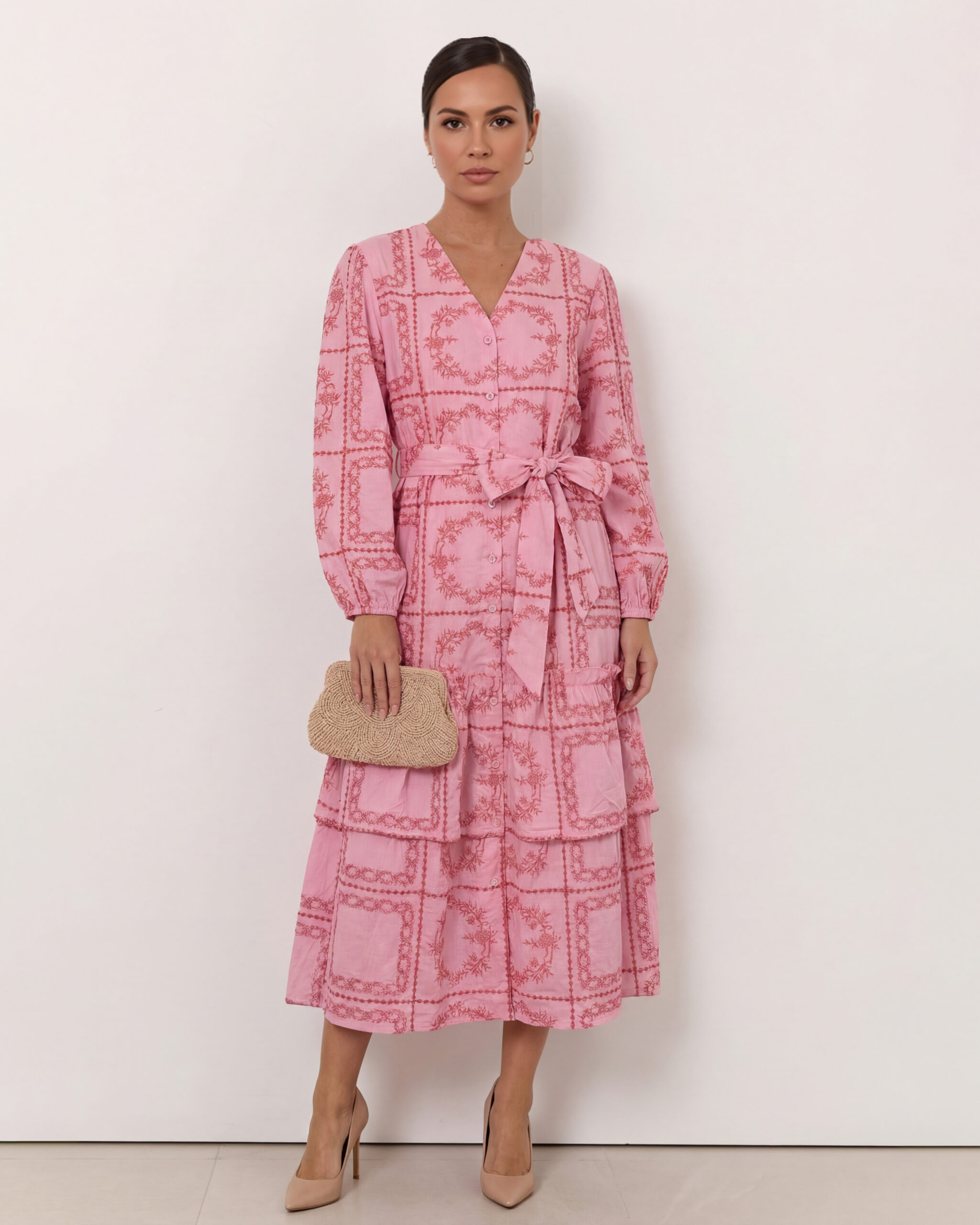 A beautifully feminine midi dress in soft cotton with a flattering tie waist and delicate vintage-inspired embroidery, perfect for effortless day-to-dinner wear.