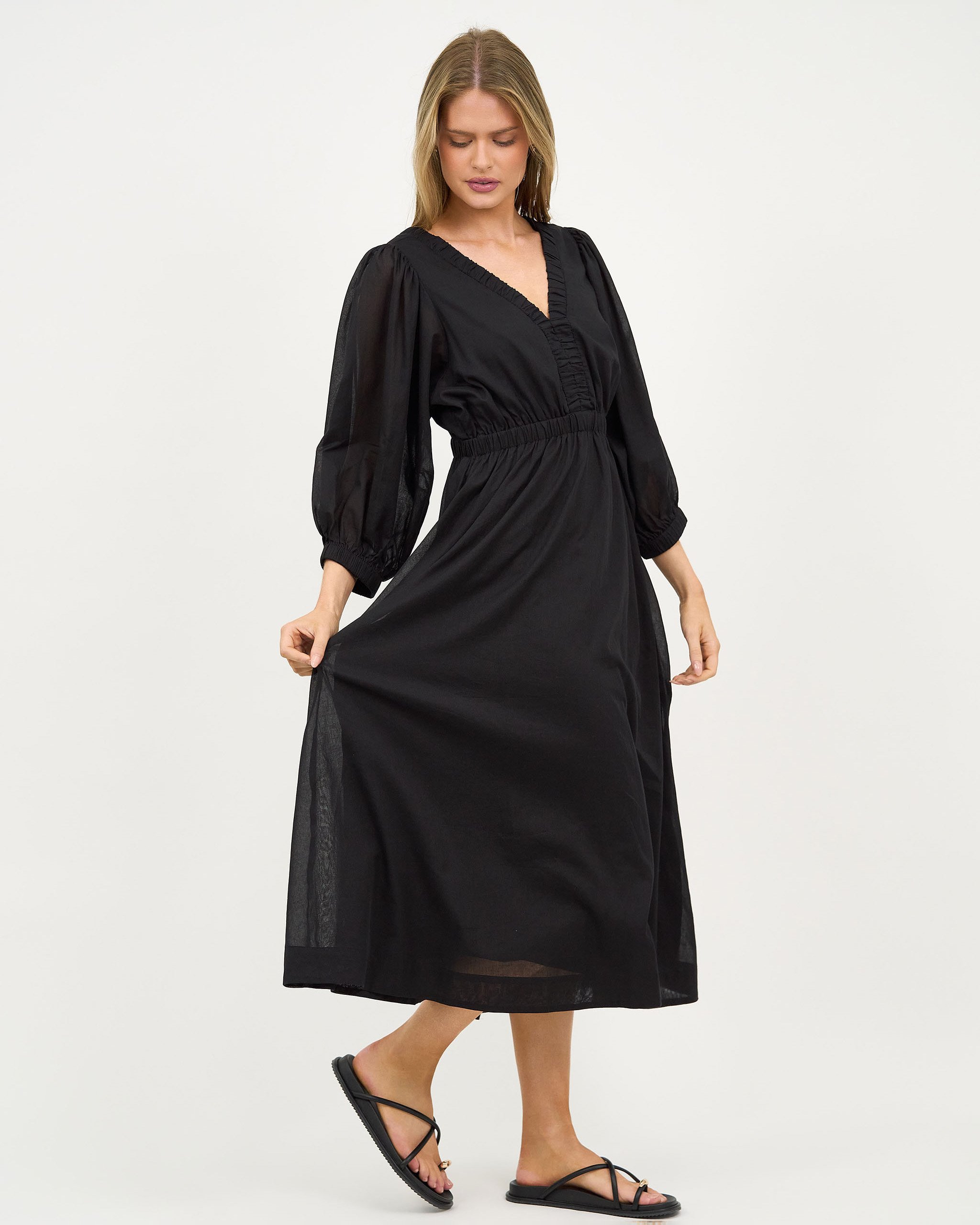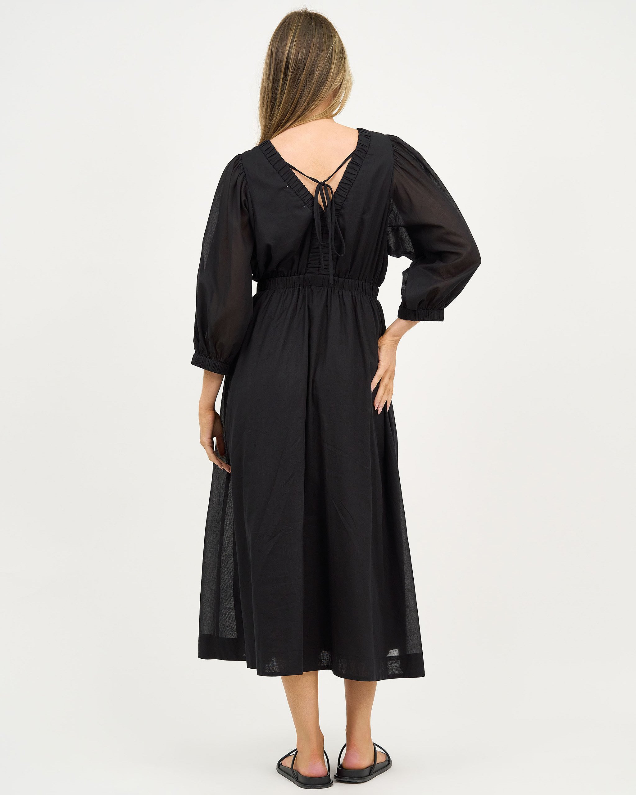 Indulge in luxury with our Gathered Neckline Midi Dress. Crafted with exquisite details and a stunning silhouette, this dress is the epitome of sophistication.