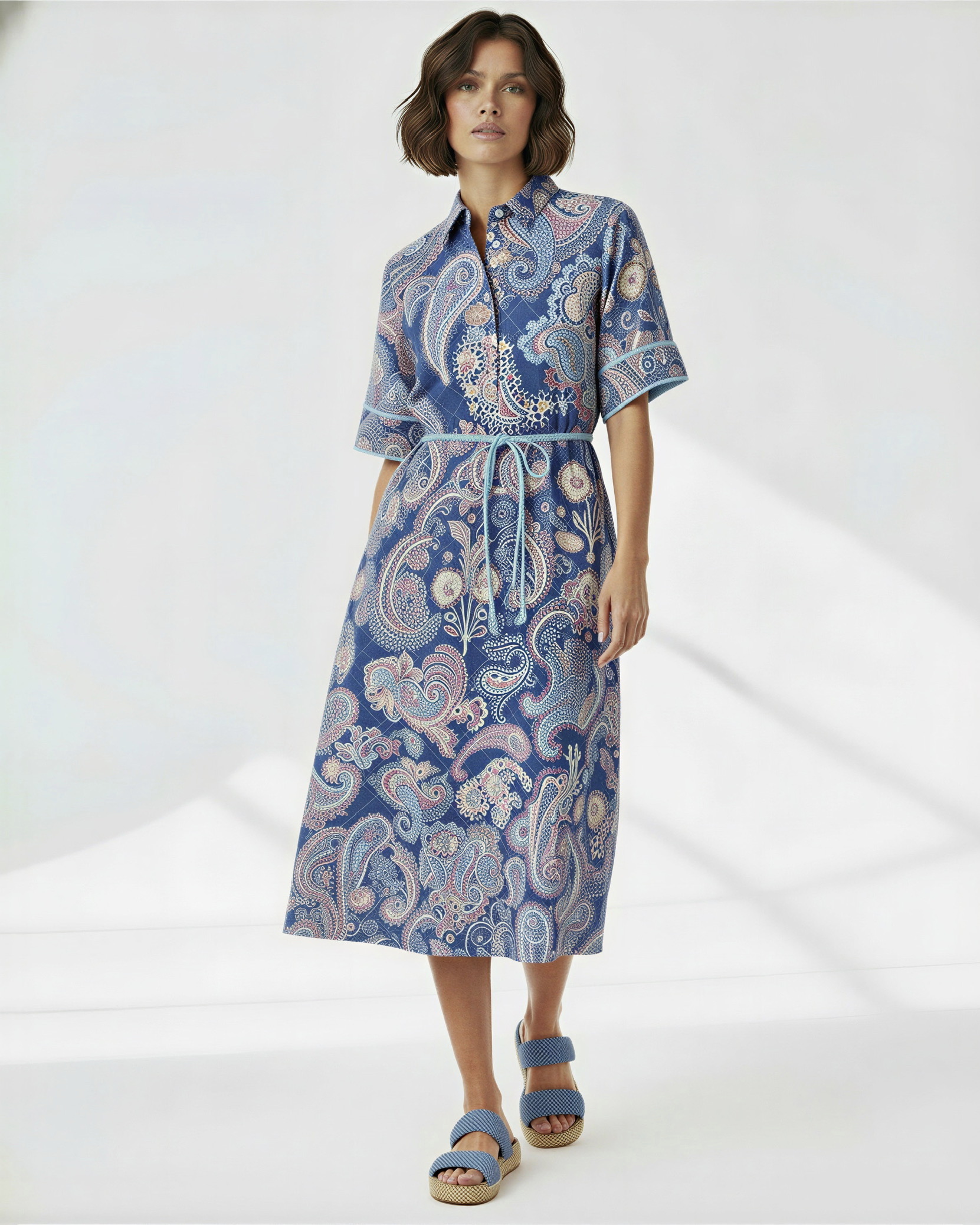 The Linen Midi Dress featuring a classic collar, V-neckline, finished with a rope belt tied at the waist.
