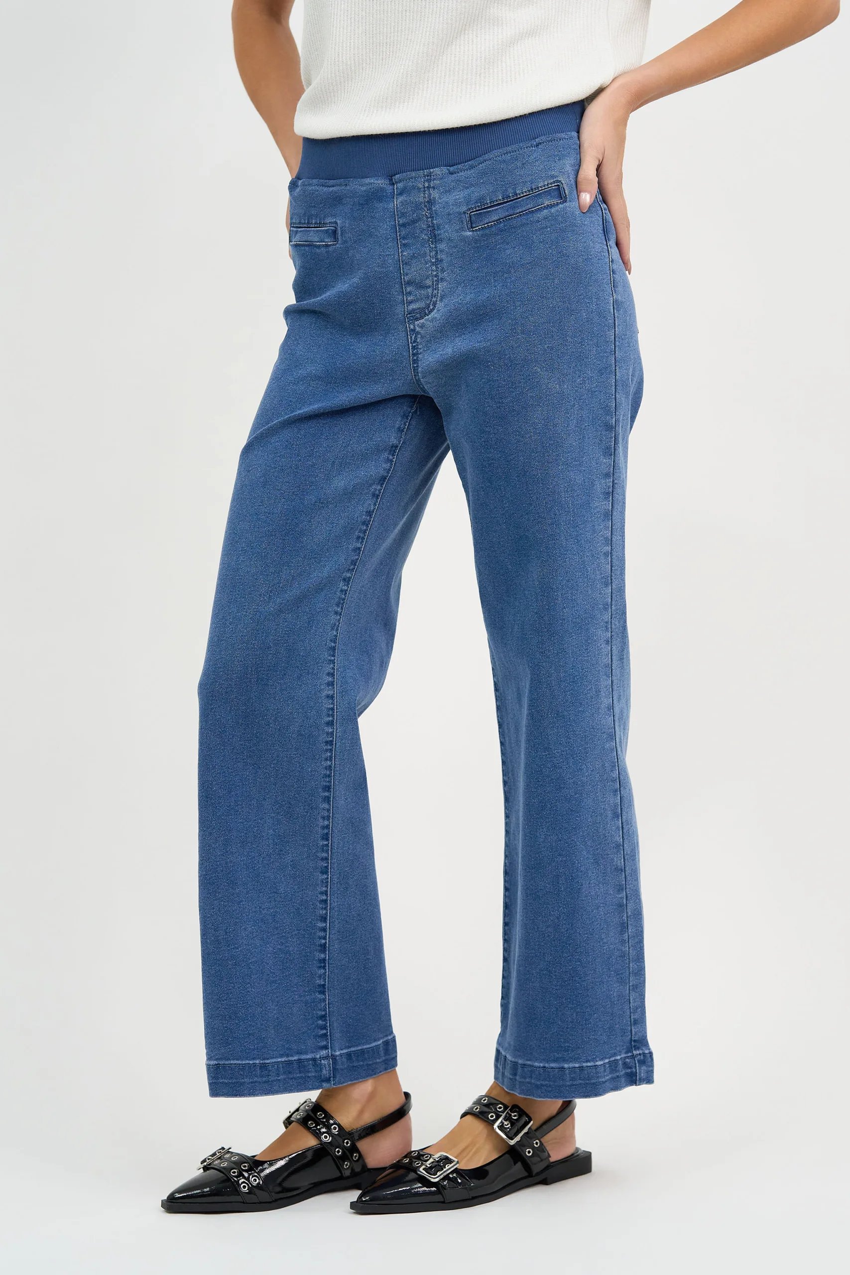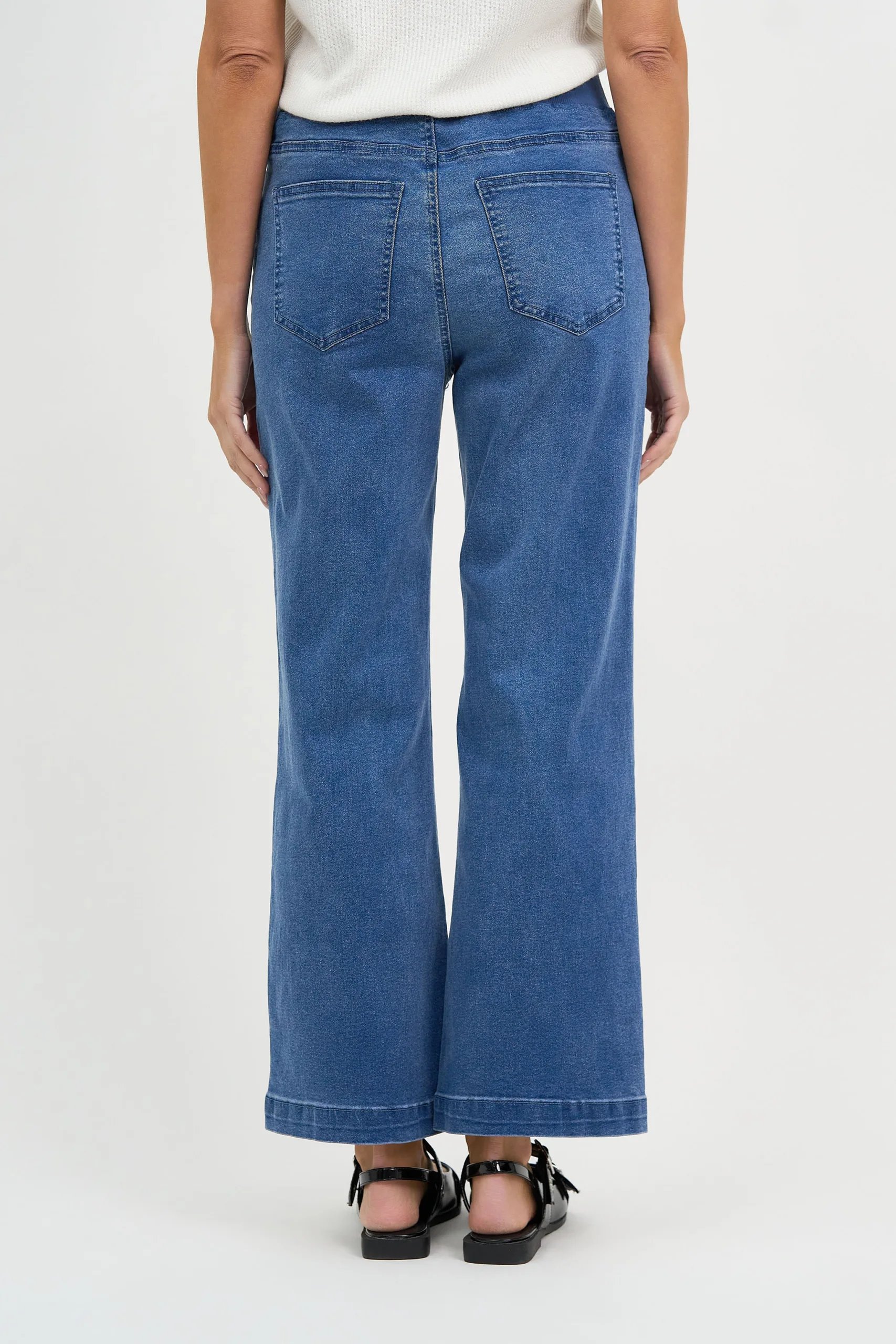 Maddy Wide Leg Jean offers effortless style with its on-trend wide-leg design, comfortable pull-on fit, and super stretch fabric. A versatile wardrobe staple for everyday wear.