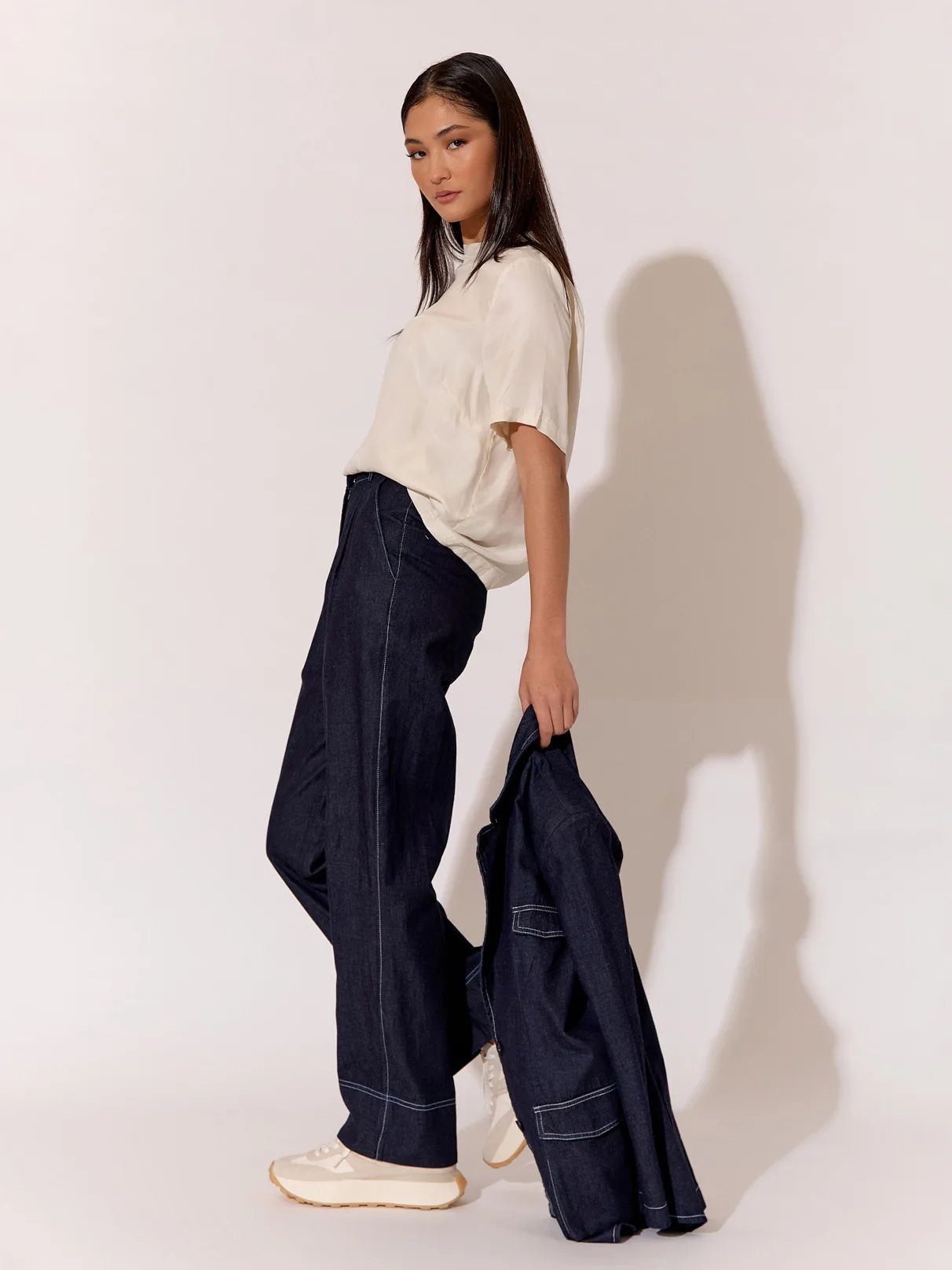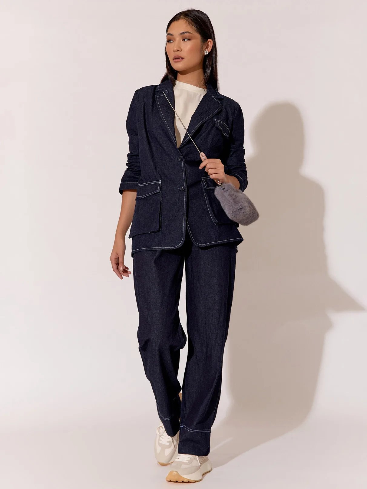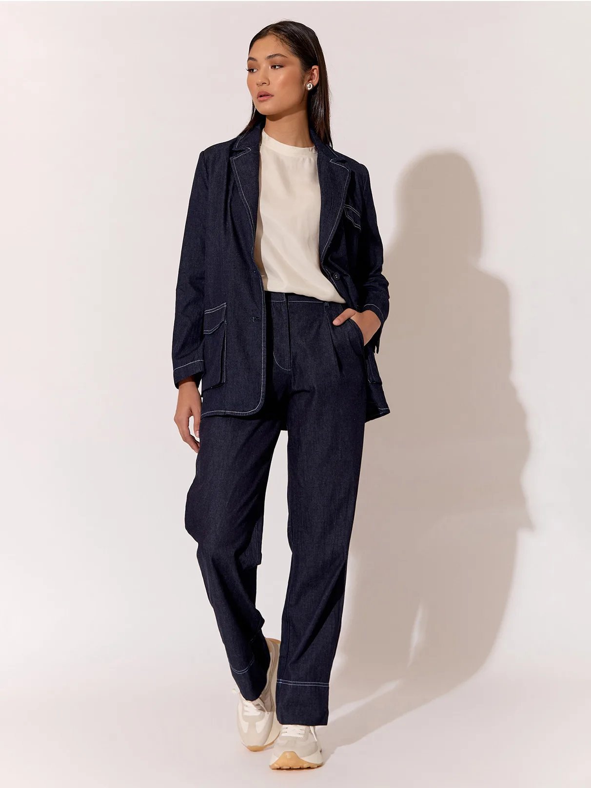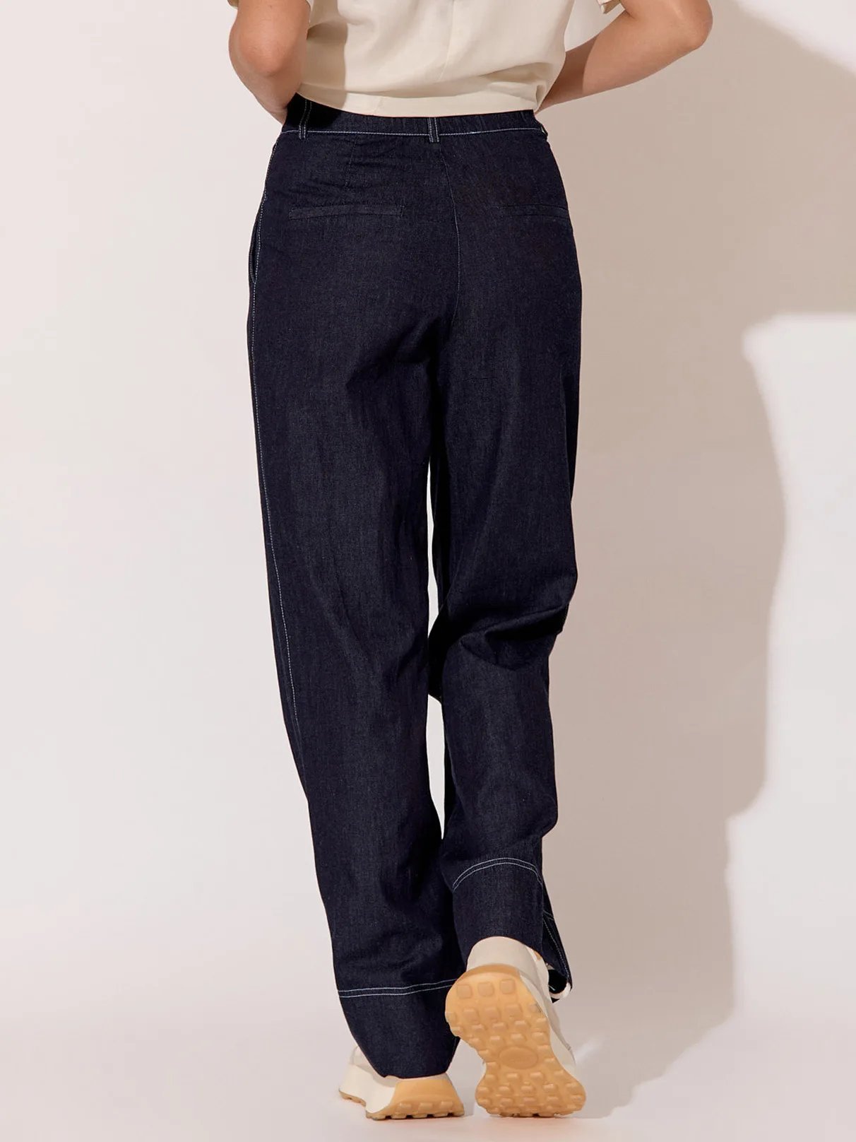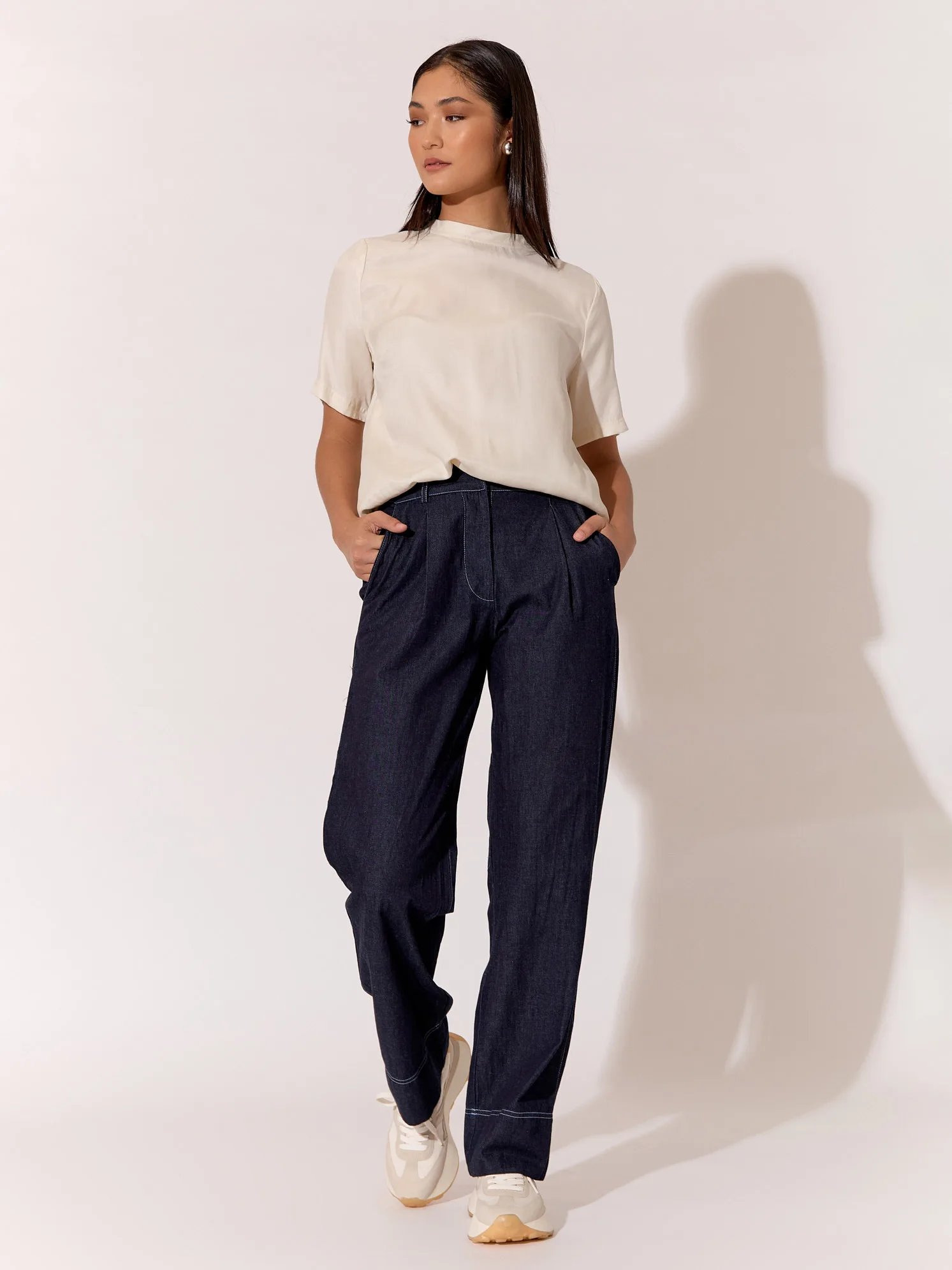 Turn heads with every step in our effortlessly chic Mavis Denim Pleat Front Pant. Pair them with a crisp white blouse for a polished daytime look, or dress them up with a sleek blazer for a night out on the town.
