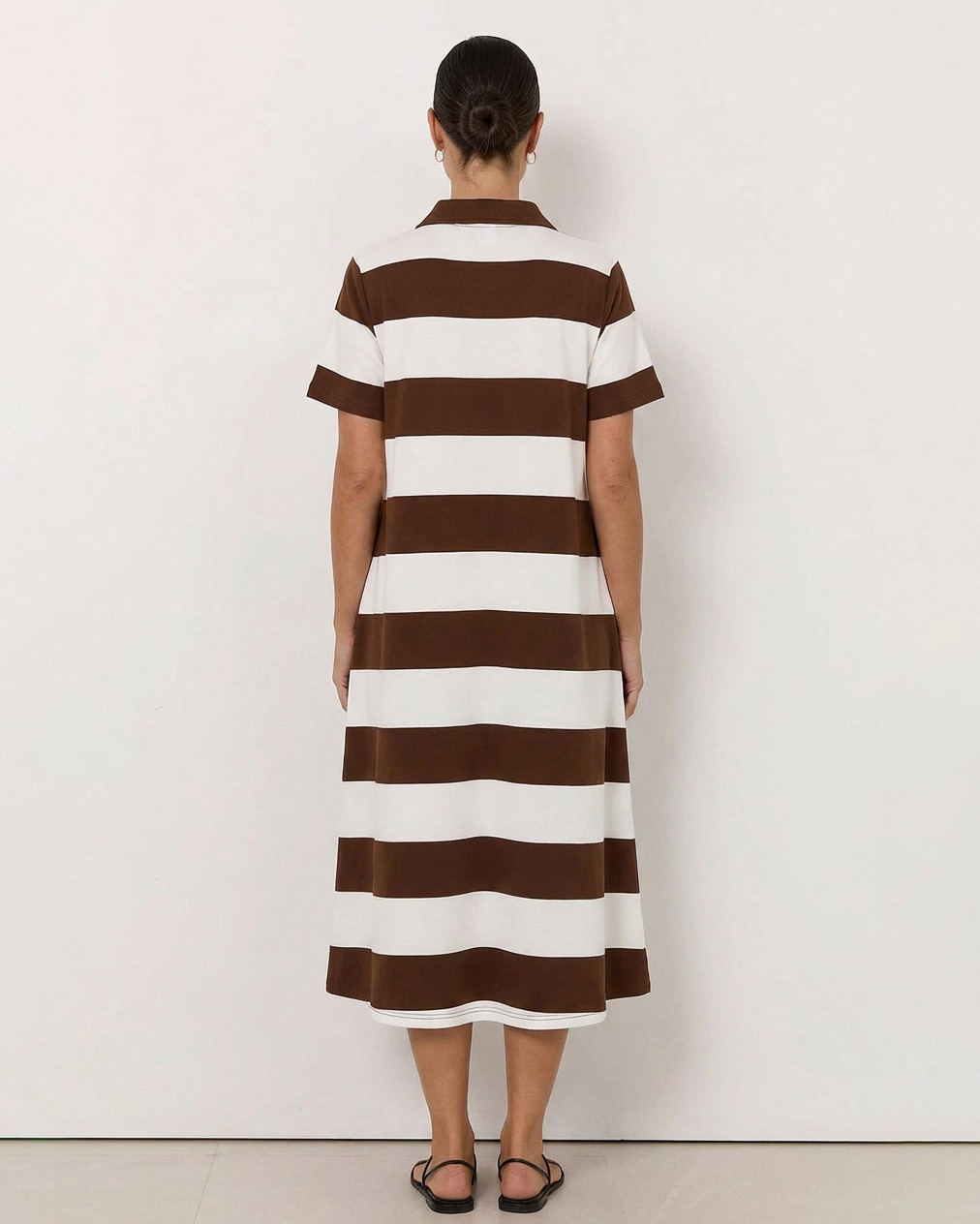 The Cotton Jersey Stripe Dress offers effortless style with its curved neckline, short sleeves, convenient side pockets, in an aline relaxed silhouette.