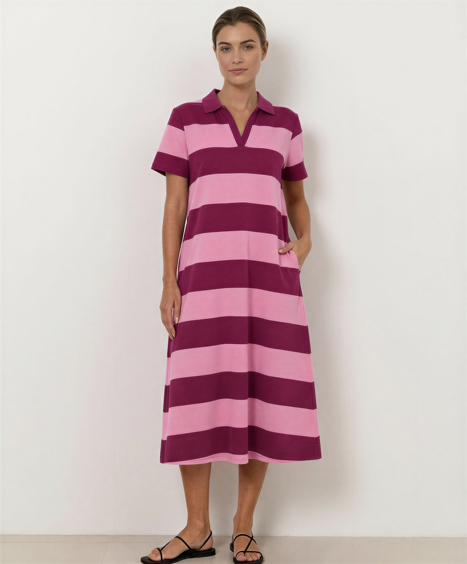 The Cotton Jersey Stripe Dress offers effortless style with its curved neckline, short sleeves, convenient side pockets, in an aline relaxed silhouette.