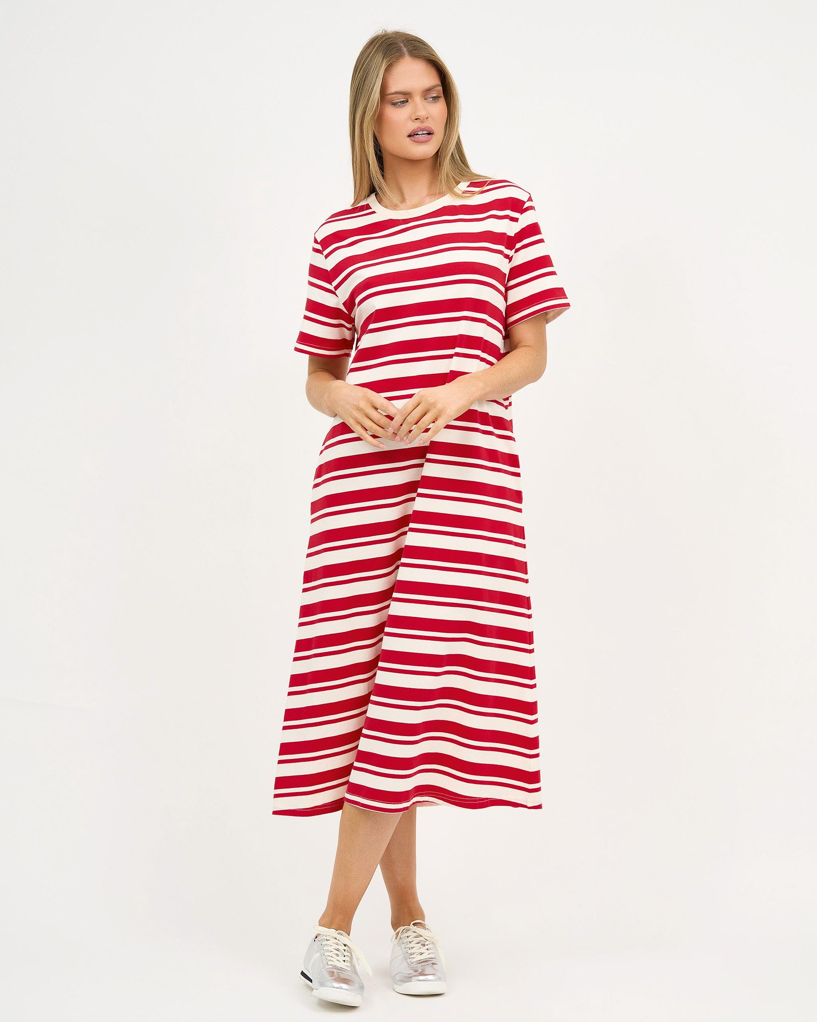 New Fit – Straight Cotton Jersey Dress offers effortless style with its relaxed straight silhouette. Designed for comfort and ease, this dress features a curved neckline, short sleeves, and practical side pockets—all crafted in soft, stretch cotton jersey.