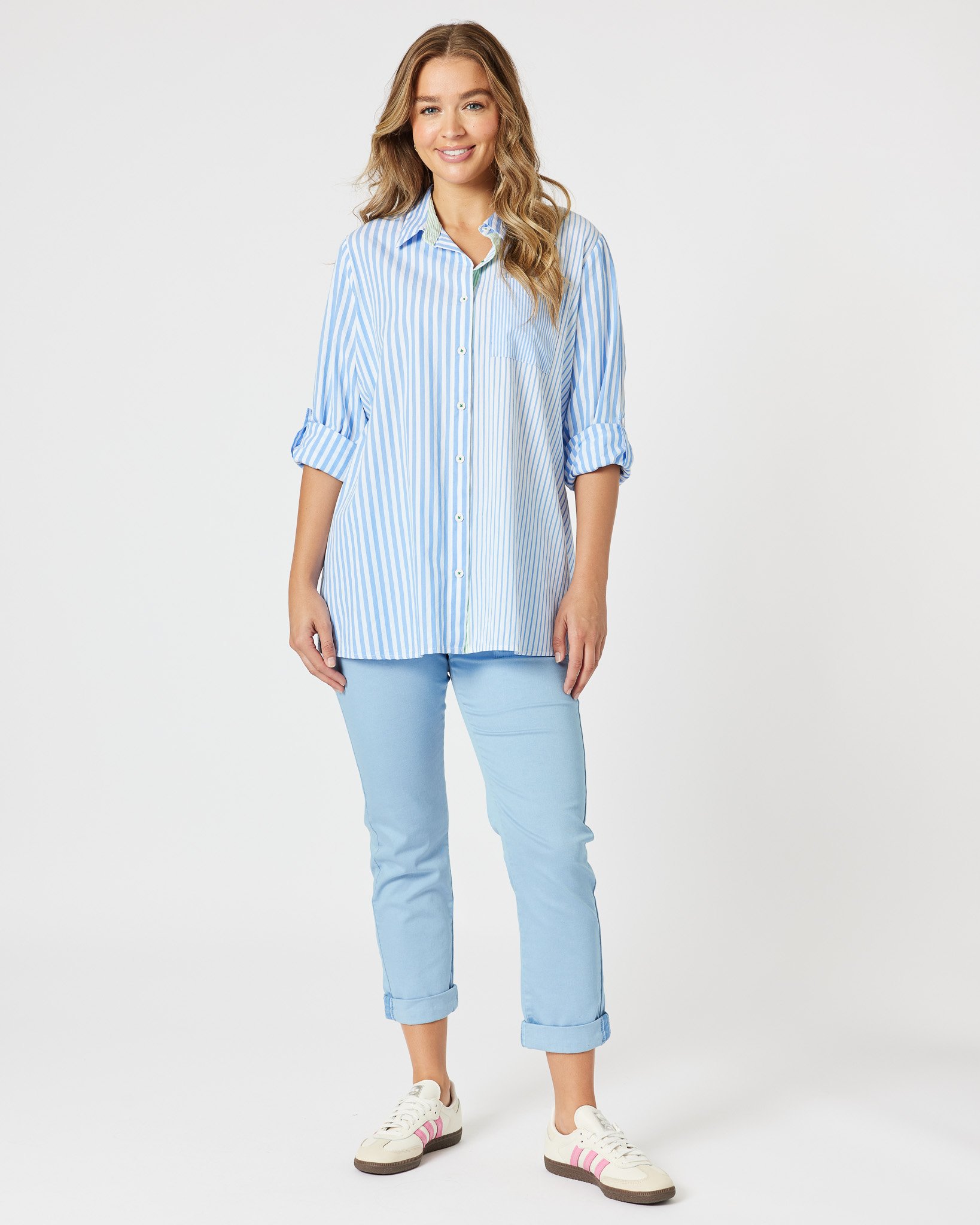 The Skylar Stripe Shirt is your go-to all-season staple, featuring playful mixed stripe detailing and a classic patch pocket. Designed for versatility, this relaxed fit shirt includes a tab sleeve option so you can switch up your look with ease. Crafted from 100% cotton for a breathable and comfortable feel.